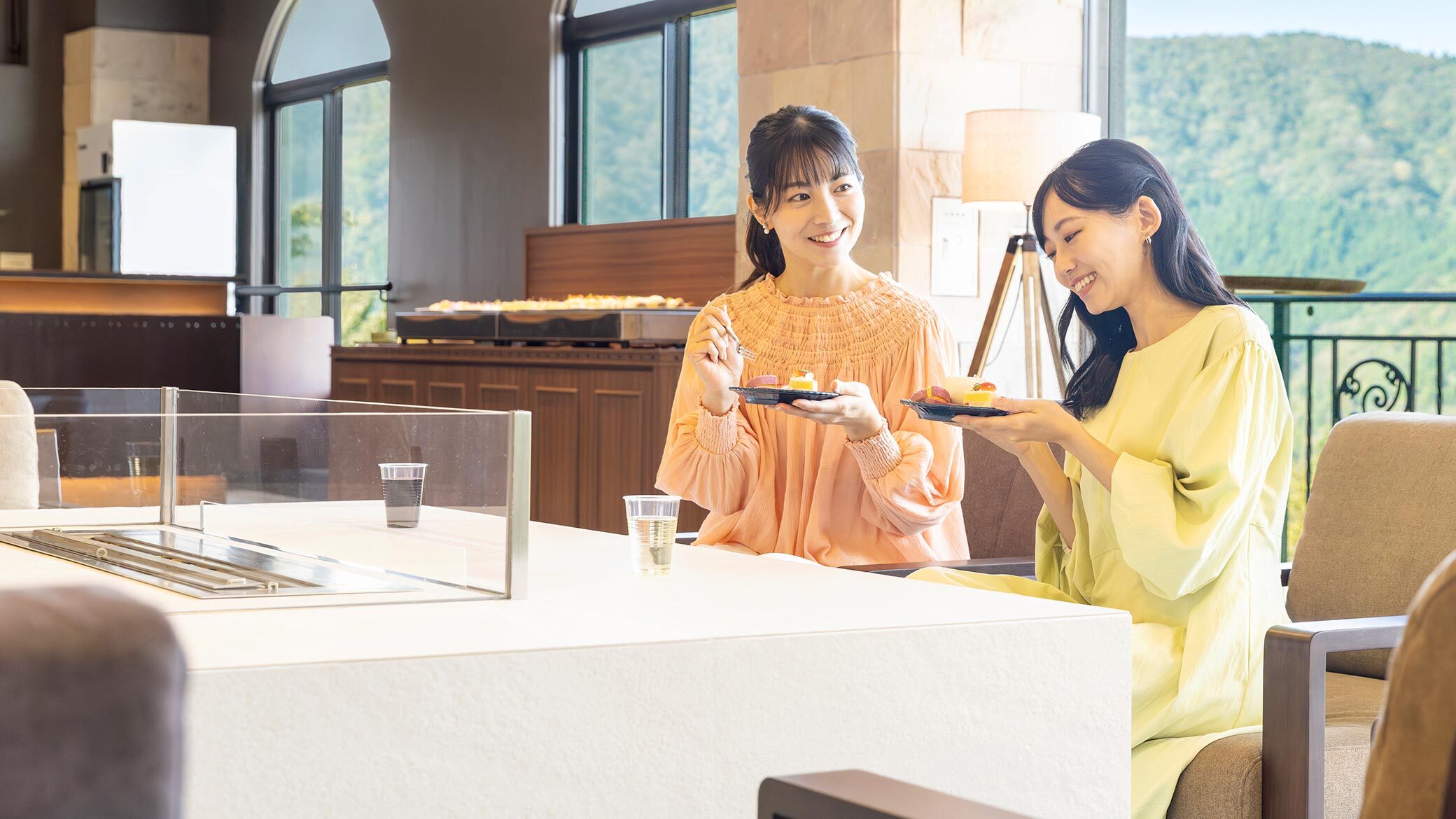 2026年3月1日より、ラウンジにてアフタヌーンティーを開催。色鮮やかな生菓子や季節のケーキが並びます。夕食後の「ナイトアフタヌーンティー」では、ご当地の日本酒やワインとのペアリングをご満喫いただけます。