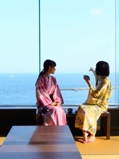 感受南國風情的海景溫泉旅館。從餐廳與客房眺望大海,盡享熱海溫泉的奢華。步行約 7 分鐘即可抵達車站前商店街,觀光便利。