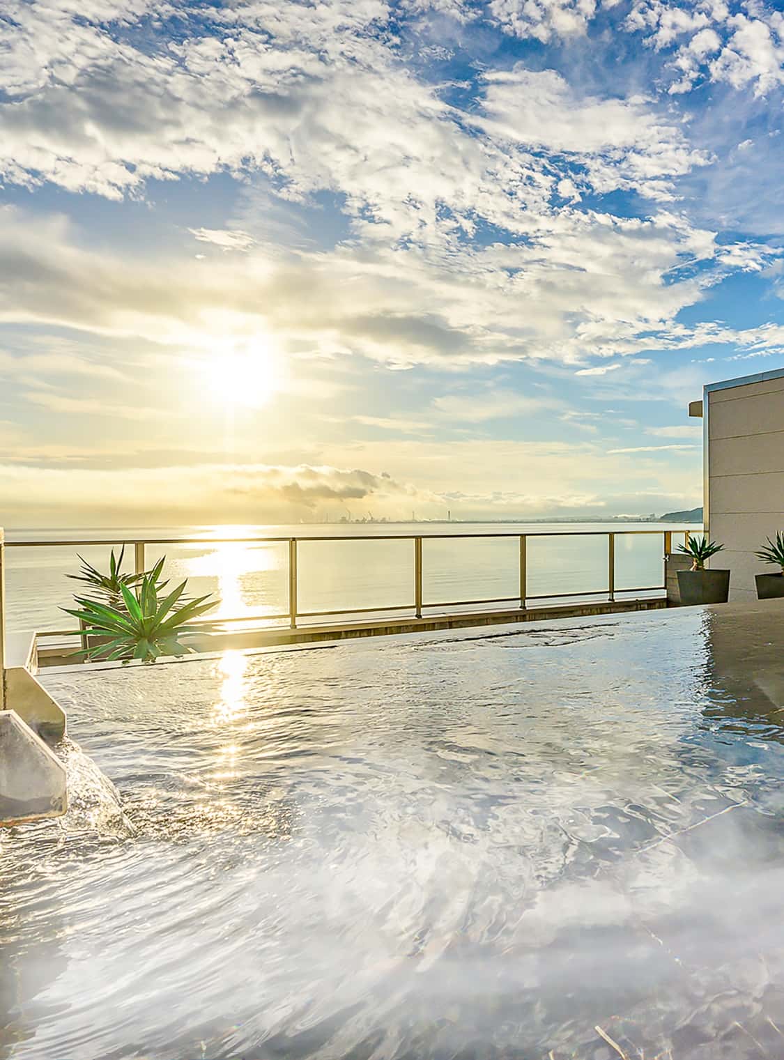 請在視野毫無遮蔽、彷彿與別府灣相連的露天風呂中,細細享受別府溫泉。一邊泡湯、一邊欣賞帶著神秘氛圍的朝霞染紅天際,是心靈得到洗滌的美好片刻