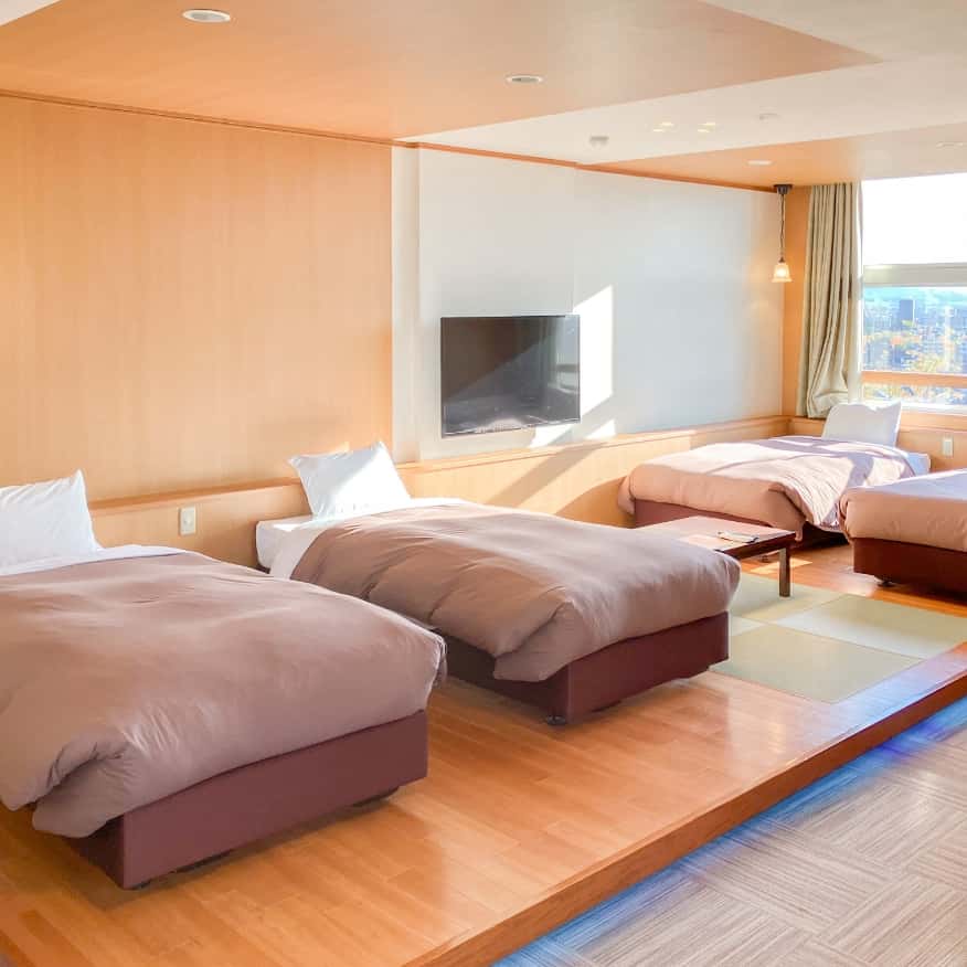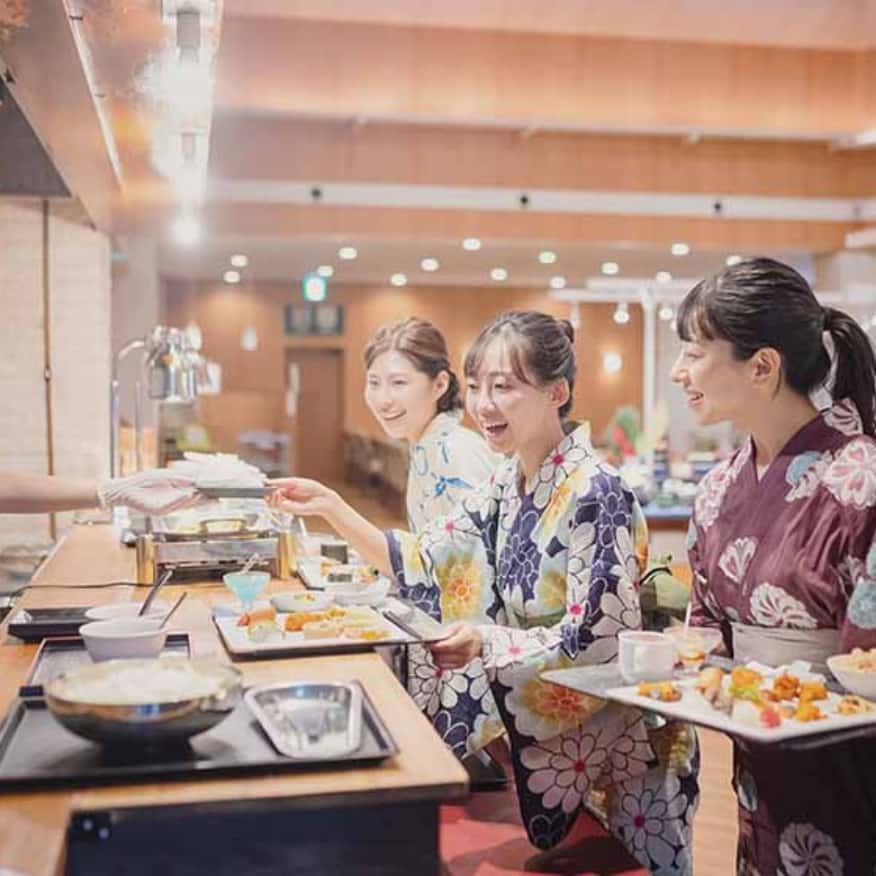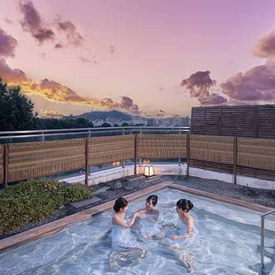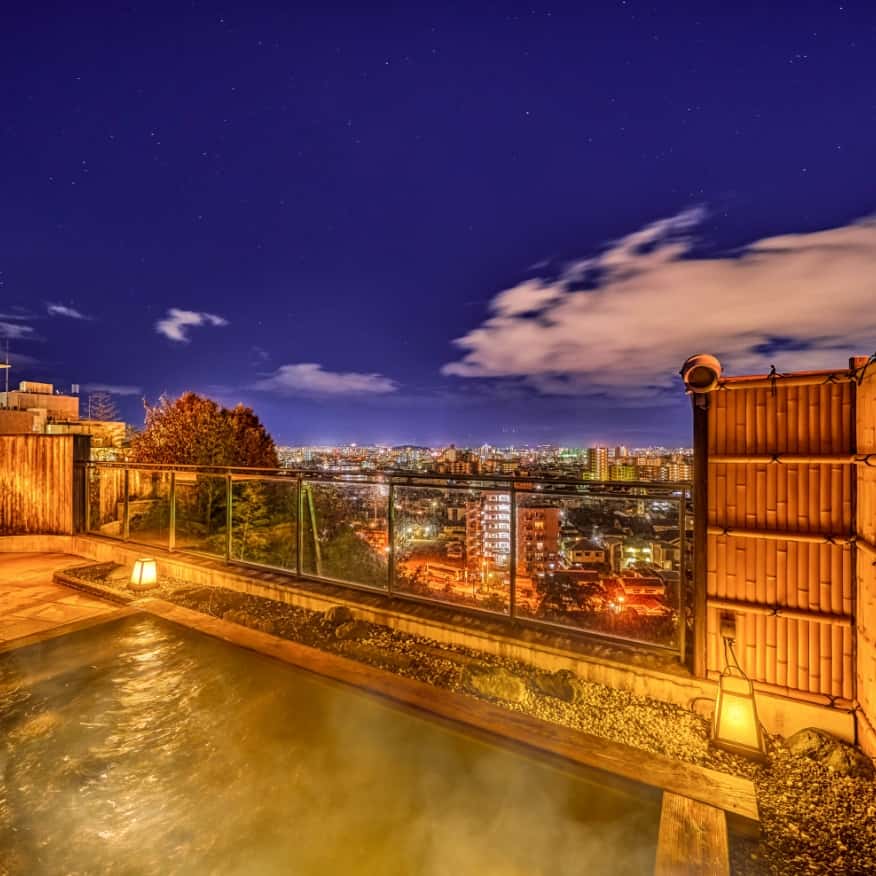 本館位於道後溫泉高地,露天溫泉可將松山城與城下美景盡收眼底。特別推薦夕陽西下與日落後的夜景。戶外亦設有桑拿,讓您在欣賞美景的同時,暢快流汗。