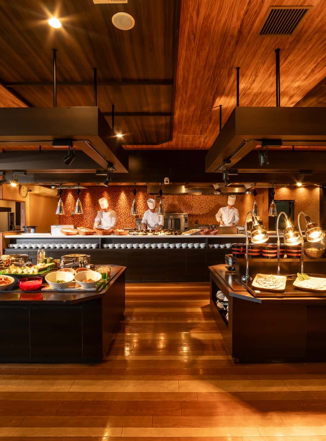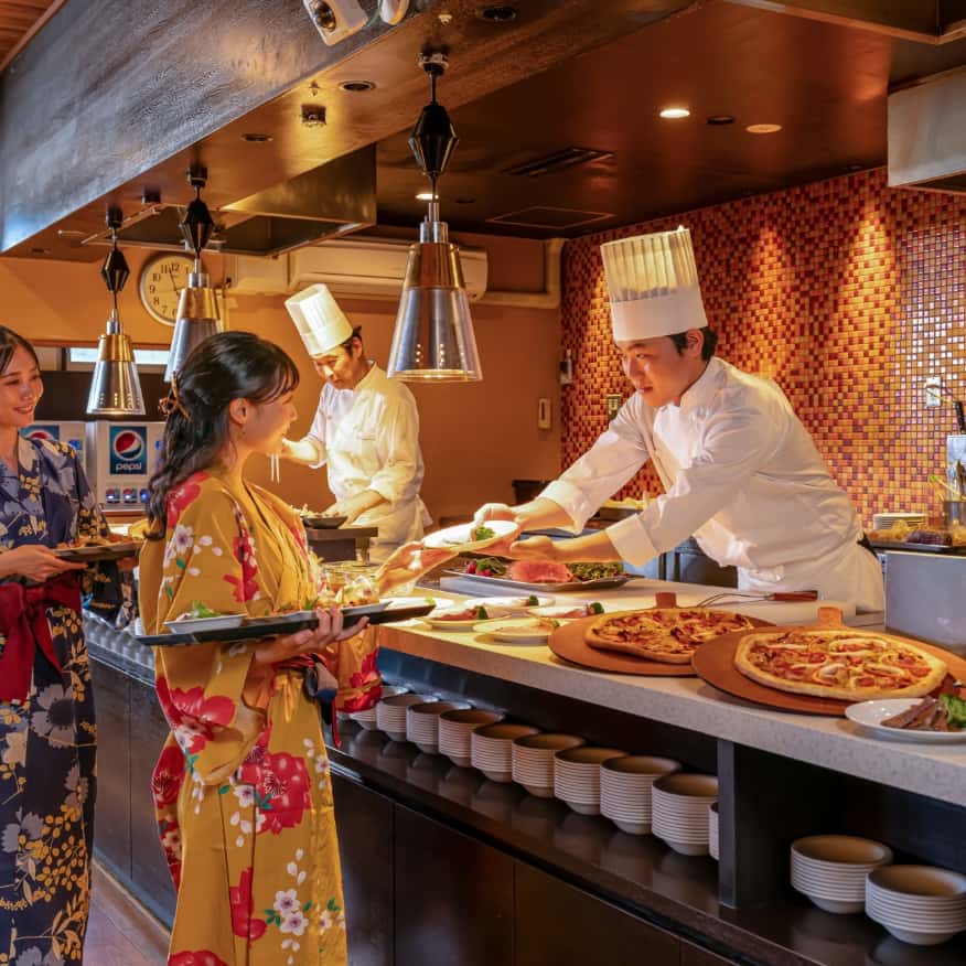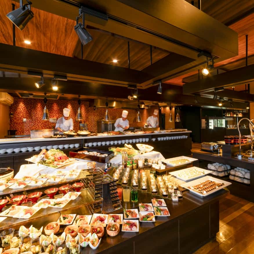 晚餐自助餐提供從肉類、海鮮料理到甜點等豐富豪華菜色吃到飽。菜單隨季節更換,無論何時造訪都能盡興。