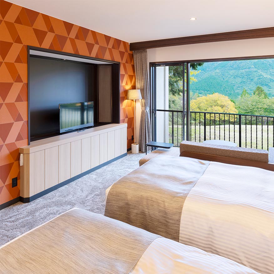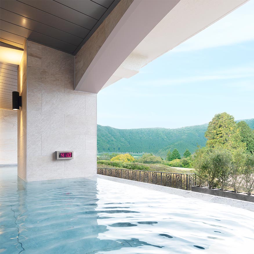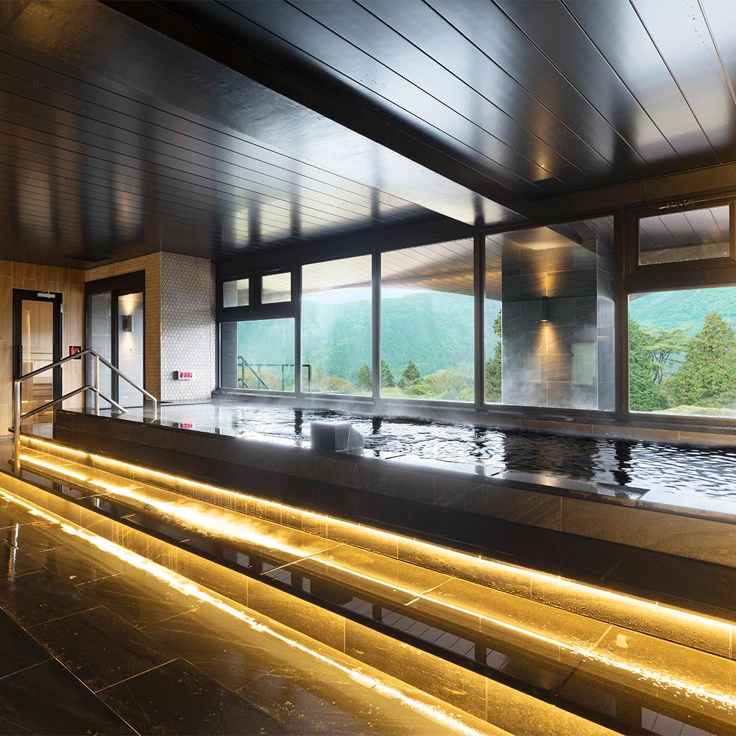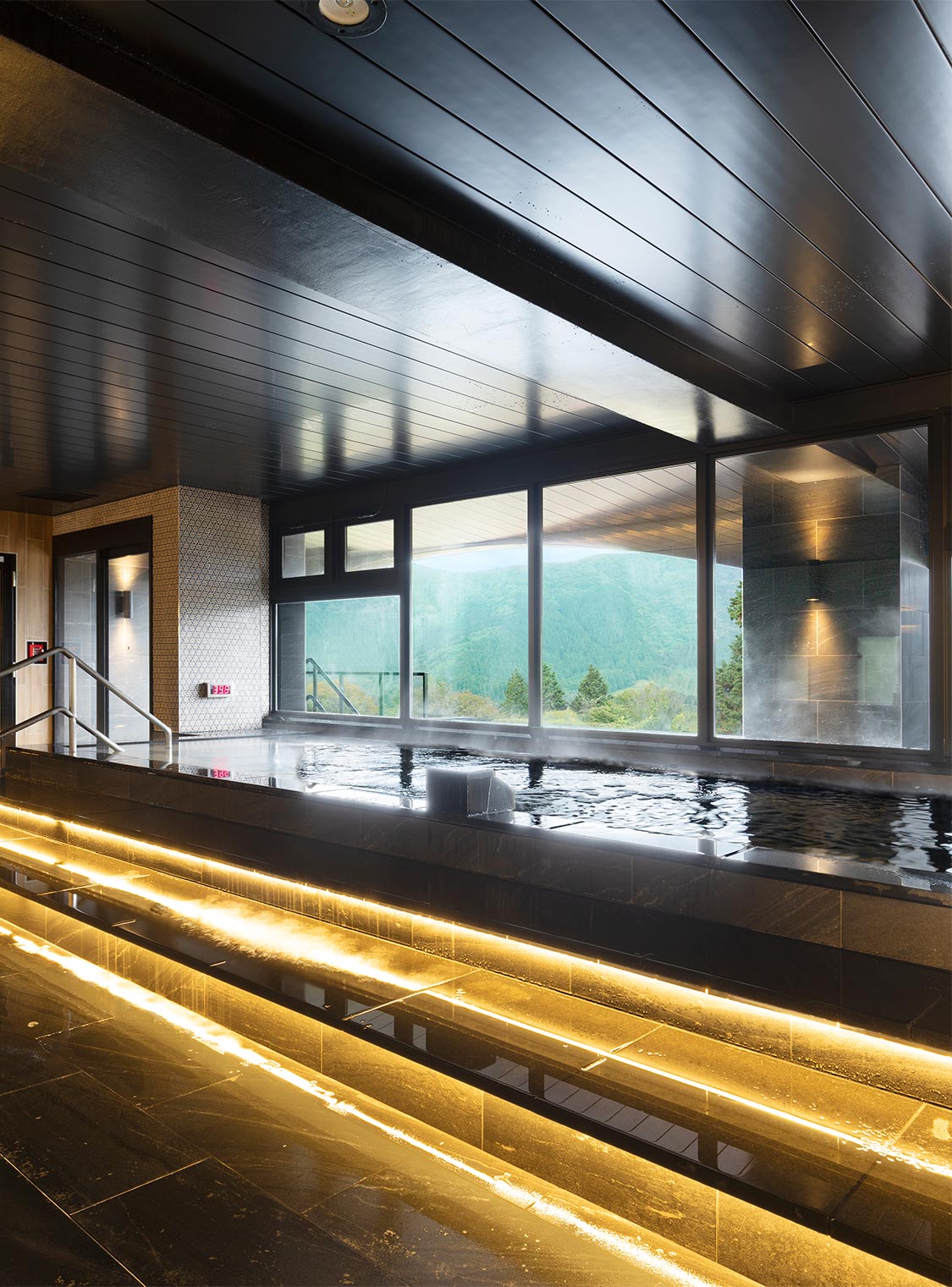 飯店備有可一覽箱根壯麗景色的大浴場。露天風呂能欣賞天空與森林融為一體的絕美景致。於現代簡約空間中盡享幸福溫泉時光。