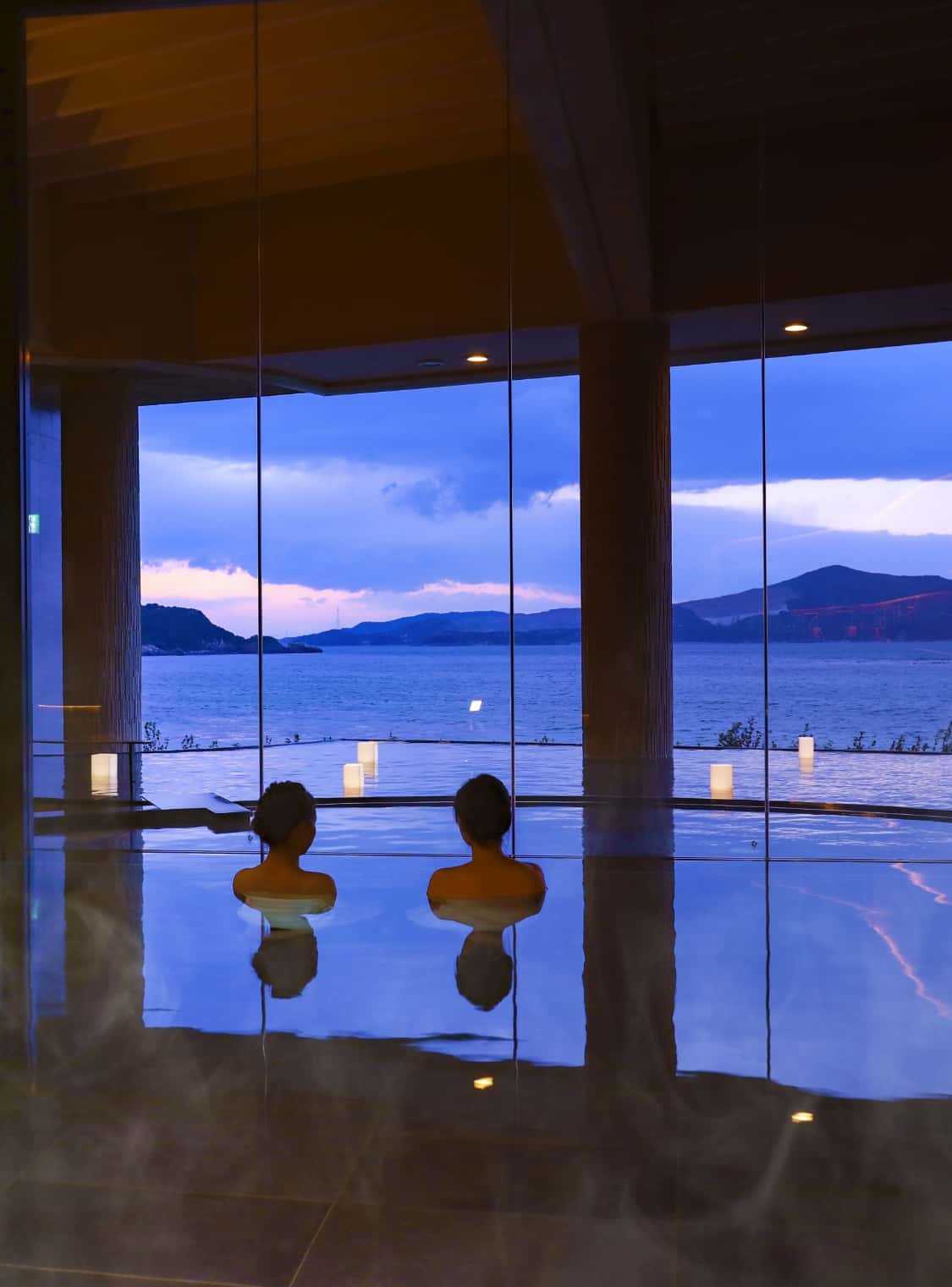 在彷彿與大海融為一體的露天溫泉裡,伴隨耳邊的浪濤聲,仰望湛藍晴空或被夕陽染紅的美麗天際,欣賞隨時間變化的絕景,度過悠然的溫泉時光。